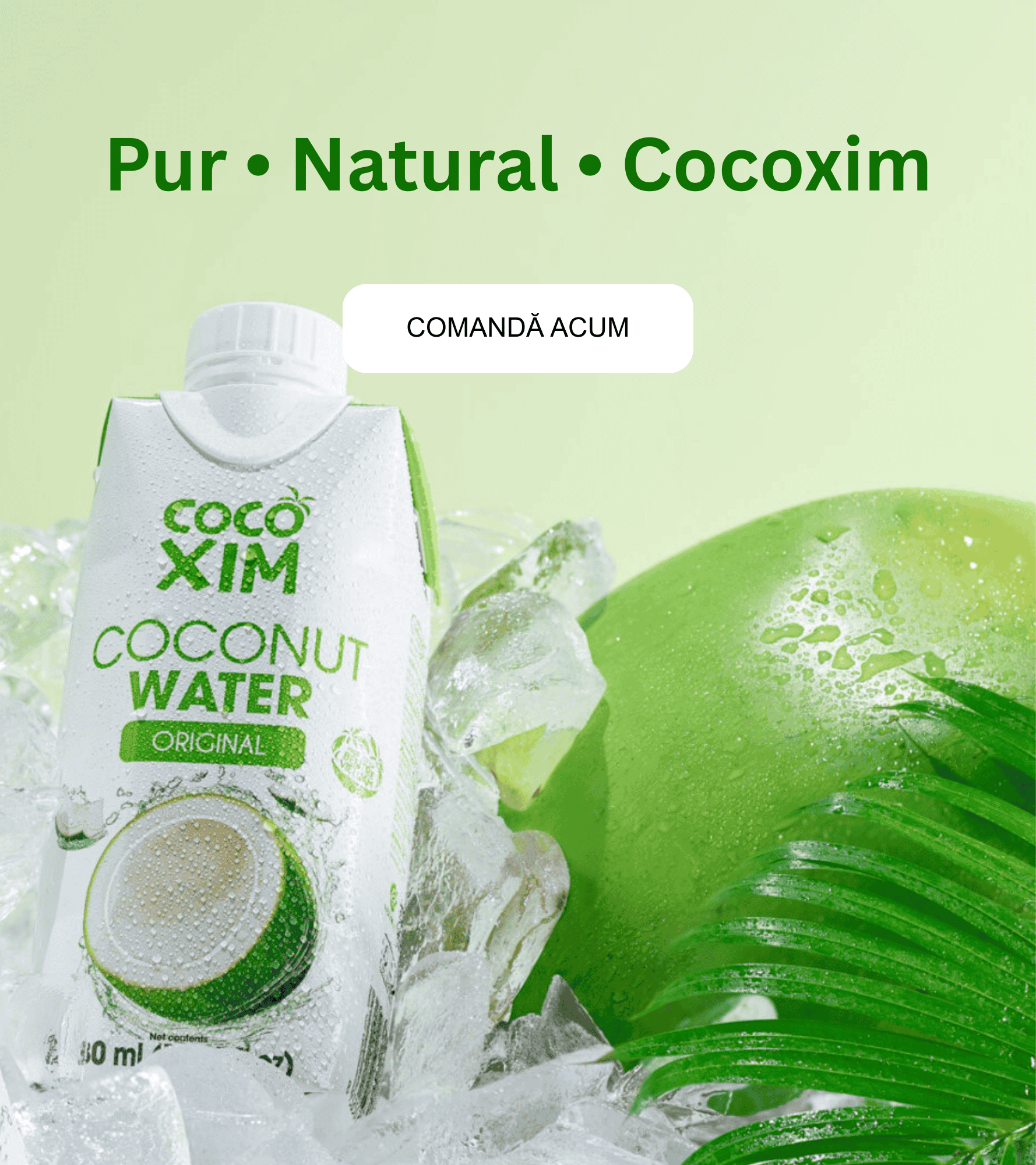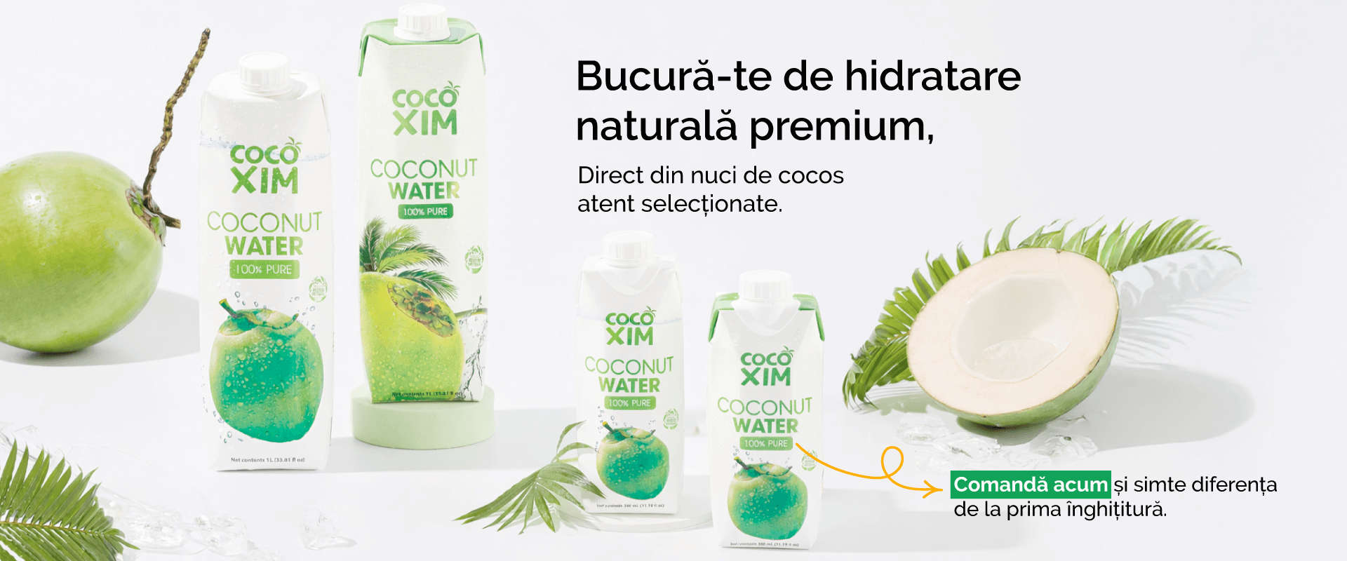 Apa de cocos Cocoxim hidratează rapid, reface electroliții, energizează natural și susține echilibrul organismului, fără zahăr adăugat, direct din nuci de cocos atent selecționate.